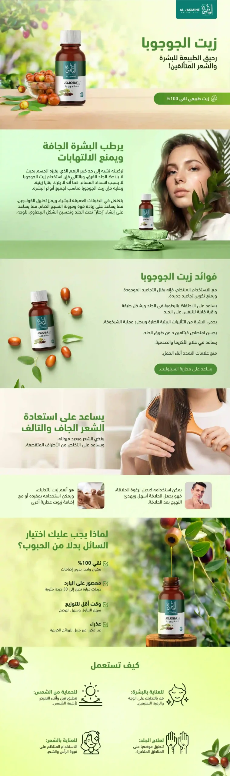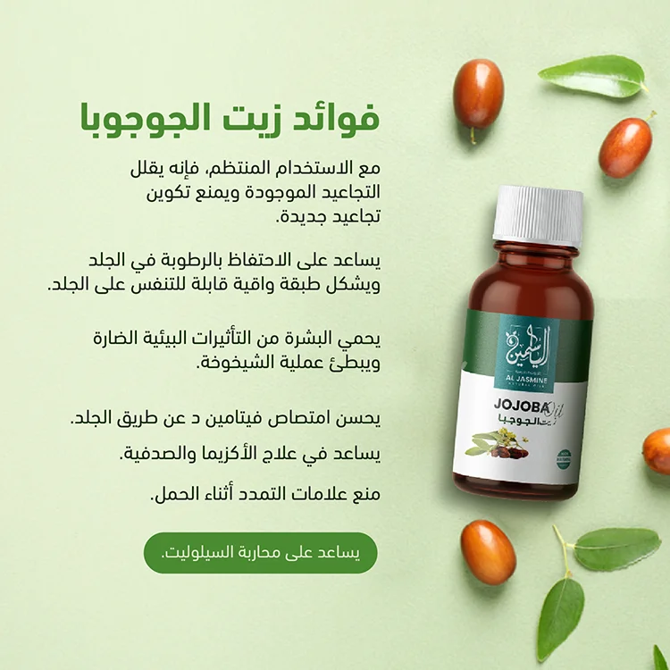 يعد زيت الجوجوبا مصدر مهم للمواد و المعادن التي تعتبر اساسية لصحة البشرة والشعر كما انه يشكل طبقة خفيفة على البشرة تعمل على حماية البشرة من التأثيرات البيئية السلبية.بالاضافة الى انه يساعد على تجديد البشرة لاحتوائه على فيتامينات A&E بتركيز عالي