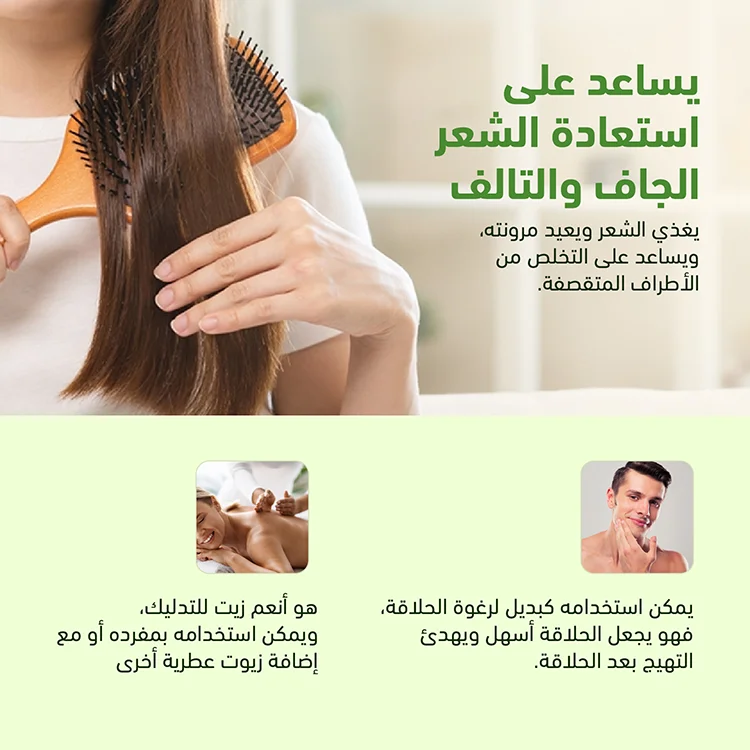 - يحسن من حالة الشعر الجاف والتالف، و يغذي الشعر ويعيد له مرونته، ويعالج الأطراف المتقصفة.