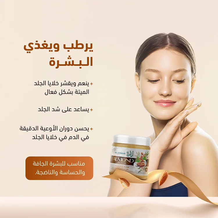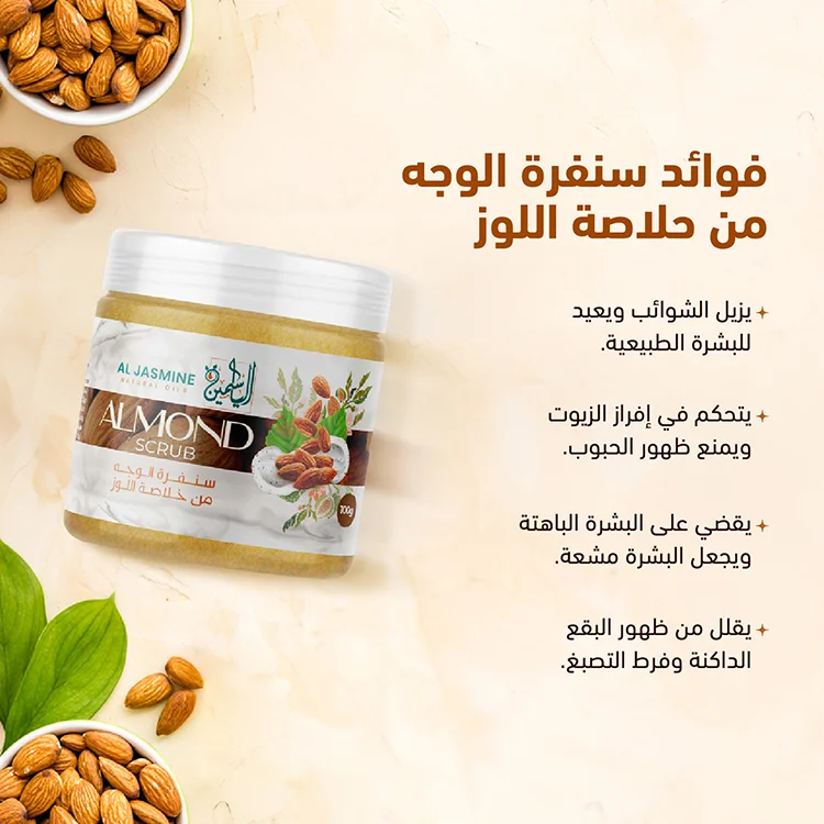 يتكون مقشر اللوز الطبيعي من خلاصة إنتاج زيت اللوز. يحتوي على كمية كبيرة من الفيتامينات بالتحديد فيتامين هـ و المعادن. كما انه يشد الجلد و يحسن تماسكه و مرونته .