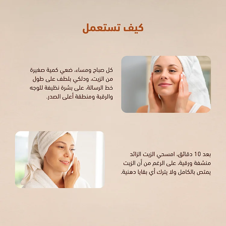 كل صباح ومساء ،يوضع كمية صغيرة من الزيت ، ويدلك بلطف على بشرة نظيفة من الوجه والعنق والصدر. بعد 10 دقائق ،يمسح الزيت الزائد بمنديل ورقي، عادة ما يتم امتصاص الزيت بالكامل ولا يترك أي بقايا دهنية.