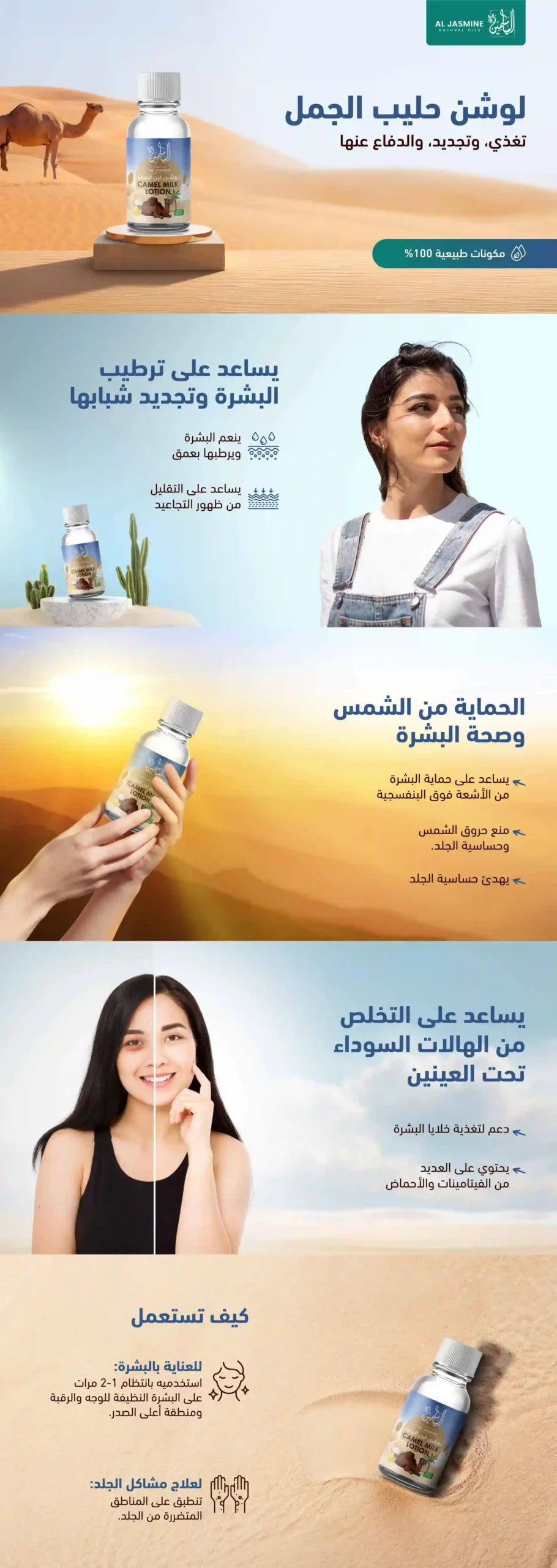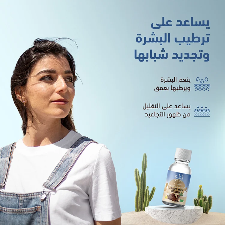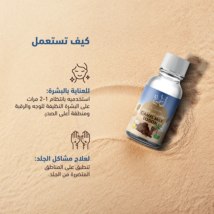 يعمل لوشن حليب الإبل على ترطيب البشرة وتجديد شبابها نظرا لاحتوائه على العديد من المكونات المفيدة كما أنه يحمي البشرة من الأشعة فوق البنفسجية ويساعد في حالات حروق الشمس و حساسية الجلد