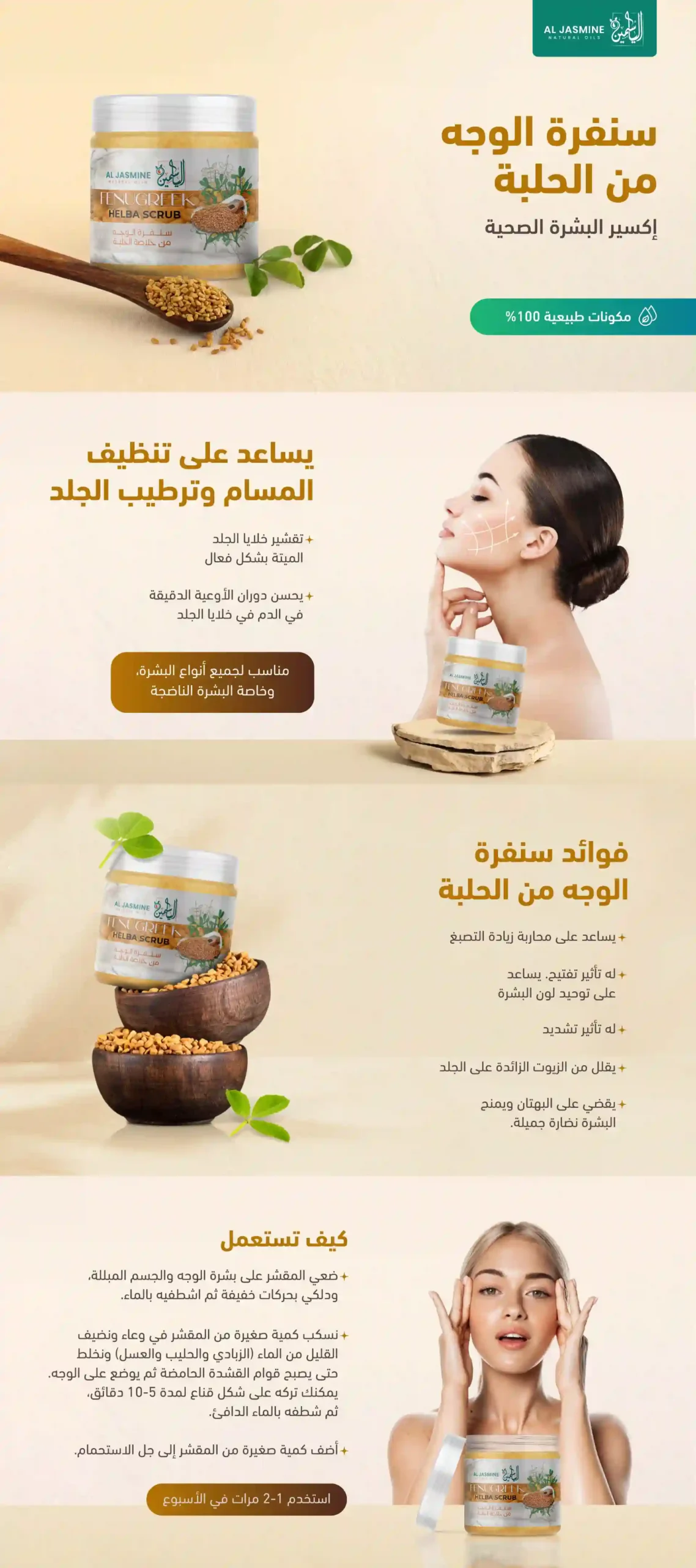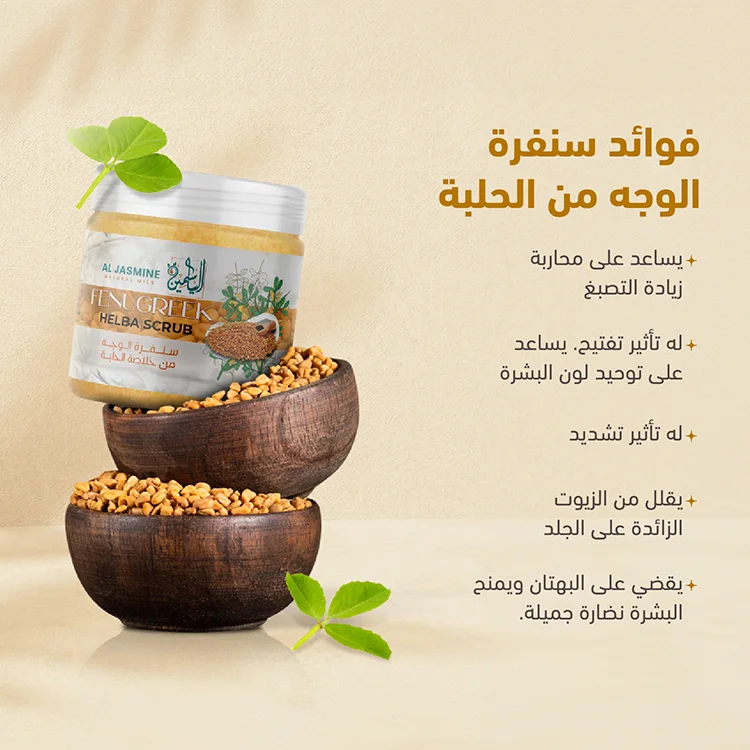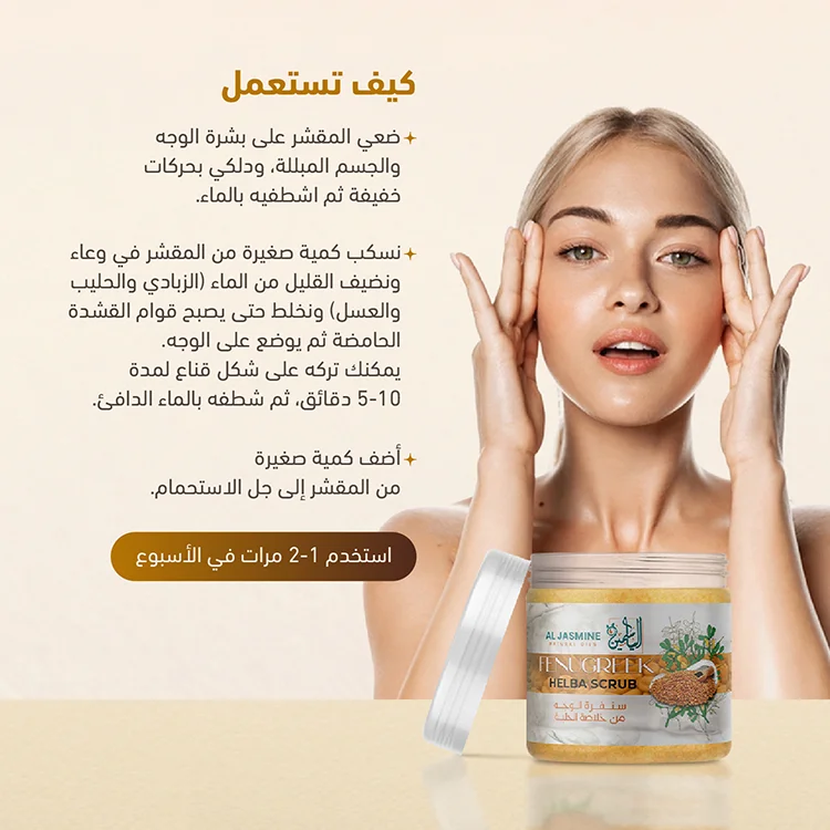 مقشر الحلبة الطبيعي 100٪ مصنوع من الثفل الناتج من إنتاج زيت الحلبة. لا يحتوي هذا المنتج الصحي عمليًا على دهون ، ولكنه يحتوي على كمية كبيرة من الفيتامينات والبروتينات ومضادات الأكسدة. يتطابق تكوين مقشر الحلبة من نواح كثيرة مع تركيبة زيت الحلبة ، الذي له تأثير مهدئ ومضاد للالتهابات ومرطب للبشرة.