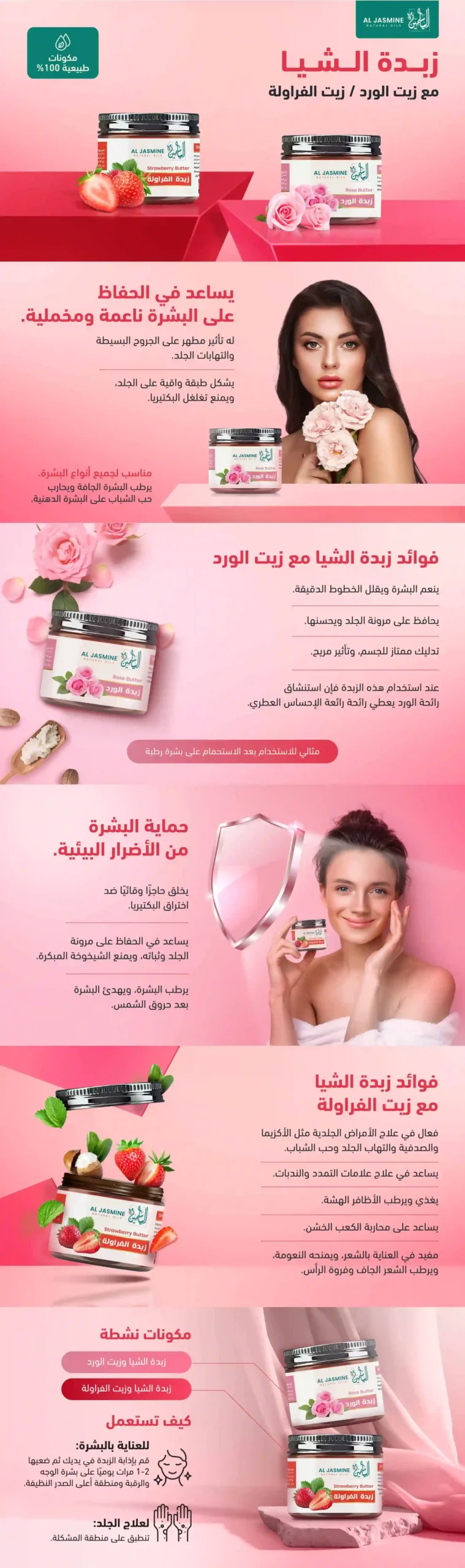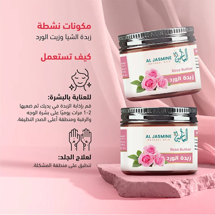 زيت الورد من الزيوت المثالية للبشرة و اضافة زبدة الشيا لهذا الزيت يمنحها خصائص لمحاربة حب الشباب و ترطيب و تنعيم البشرة .
